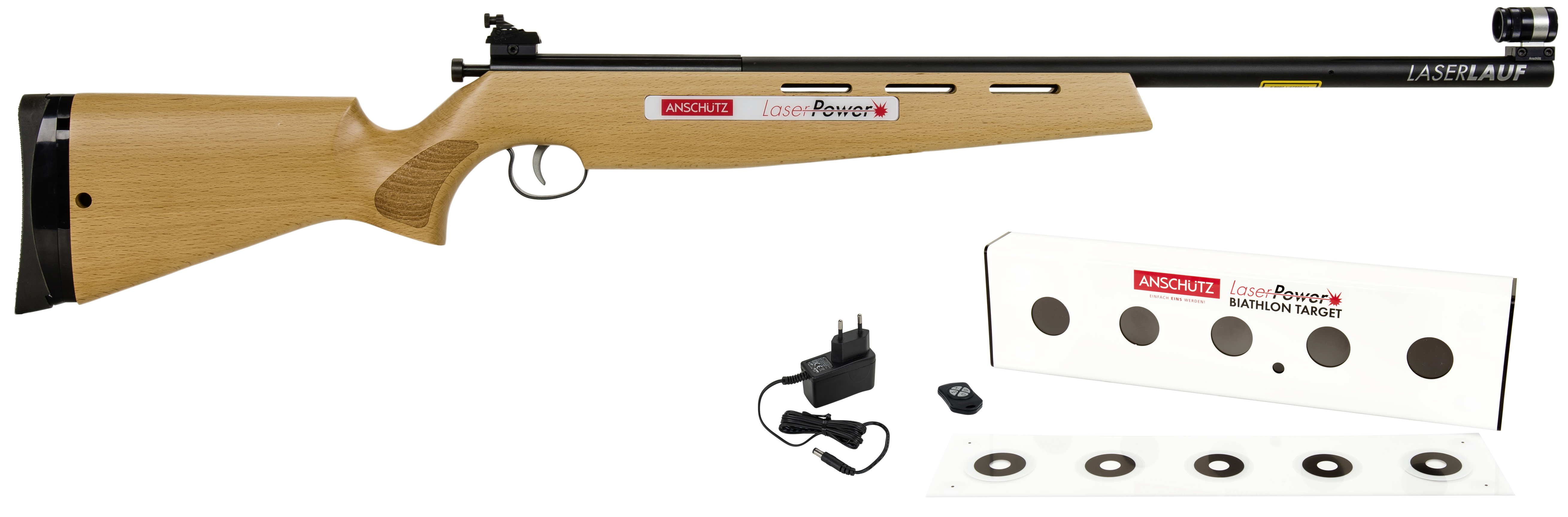 Lieferumfang des Anschütz LaserPower IV Profi Level Sets: Das Komplettpaket enthält das Laser Power IV Gewehr inkl. 2 Stück AAA Batterien, Gummischaftkappe, Korntunnel, Diopter, Visierlinienerhöhung, Zwischenplatte 4709P, USB auf DC Kabel, Zielbox Zielbox inkl. 4 Stück AA Batterien, Zielreduzierung, Werkzeugset, IR-Fernbedienung und eine ausführliche Bedienungsanleitung.
